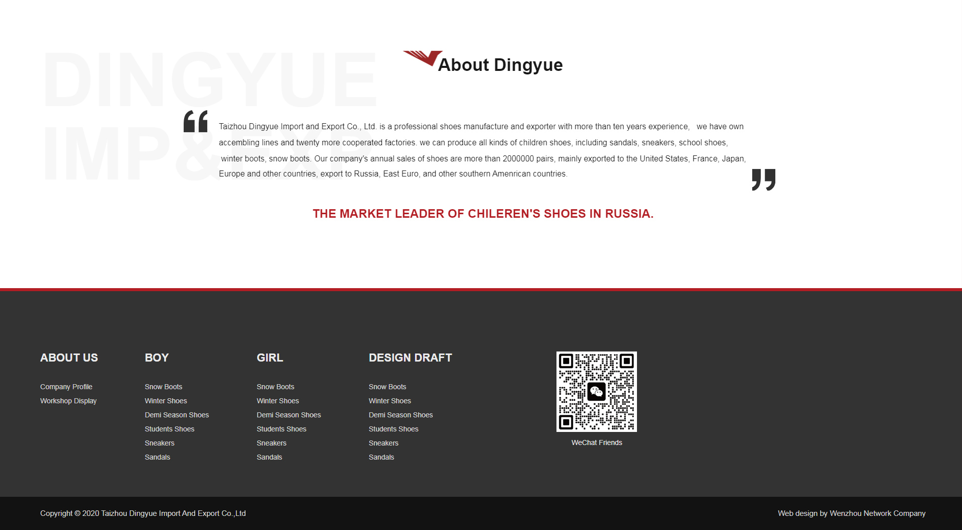 aizhou Dingyue Import and Export Co., Ltd. is a professional shoes manufacture and exporter with more than ten years experience, we have own accembling lines and twenty more cooperated factories. we can produce all kinds of children shoes, including sandals, sneakers, school shoes, winter boots, snow boots. Our company′s annual sales of shoes are more than 2000000 pairs, mainly exported to the United States, France, Japan, Europe and other countries, export to Russia, East Euro, and other southern Amenrican countries.